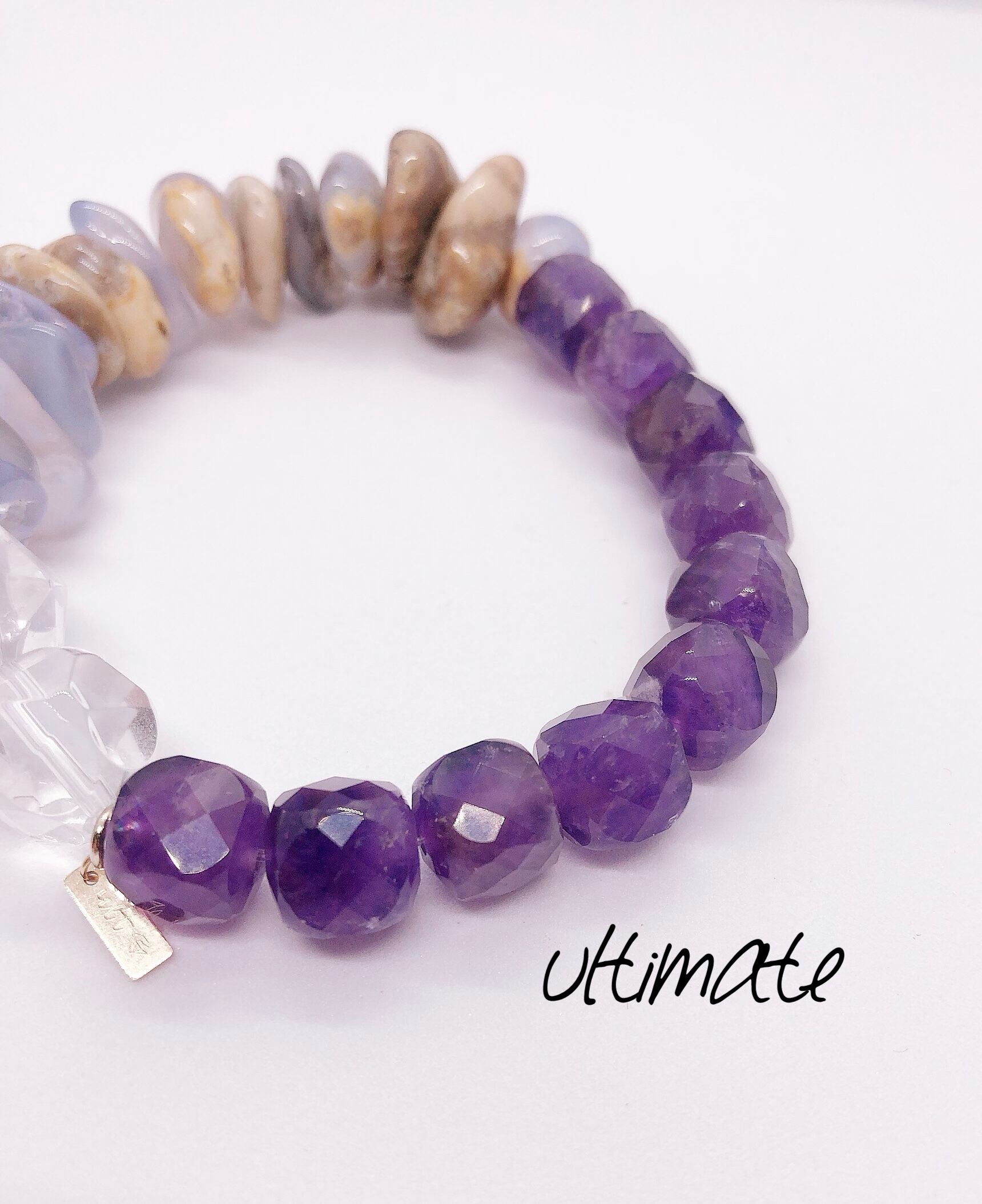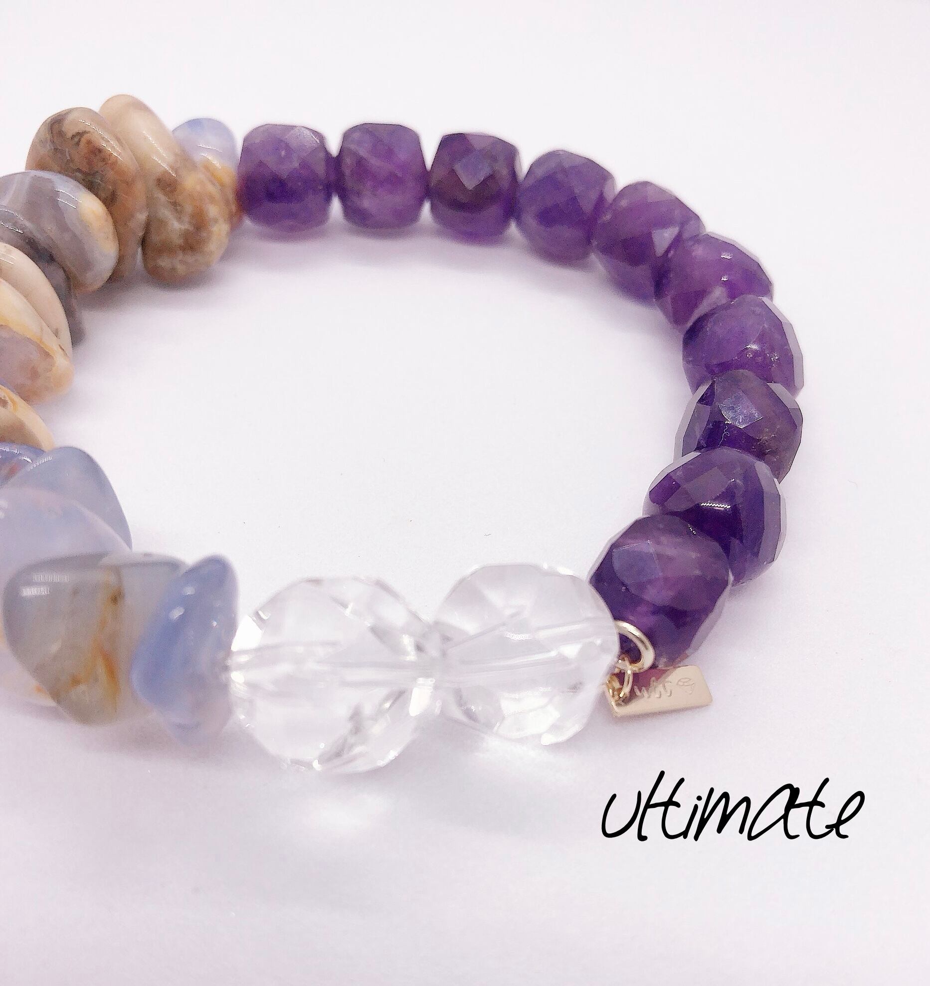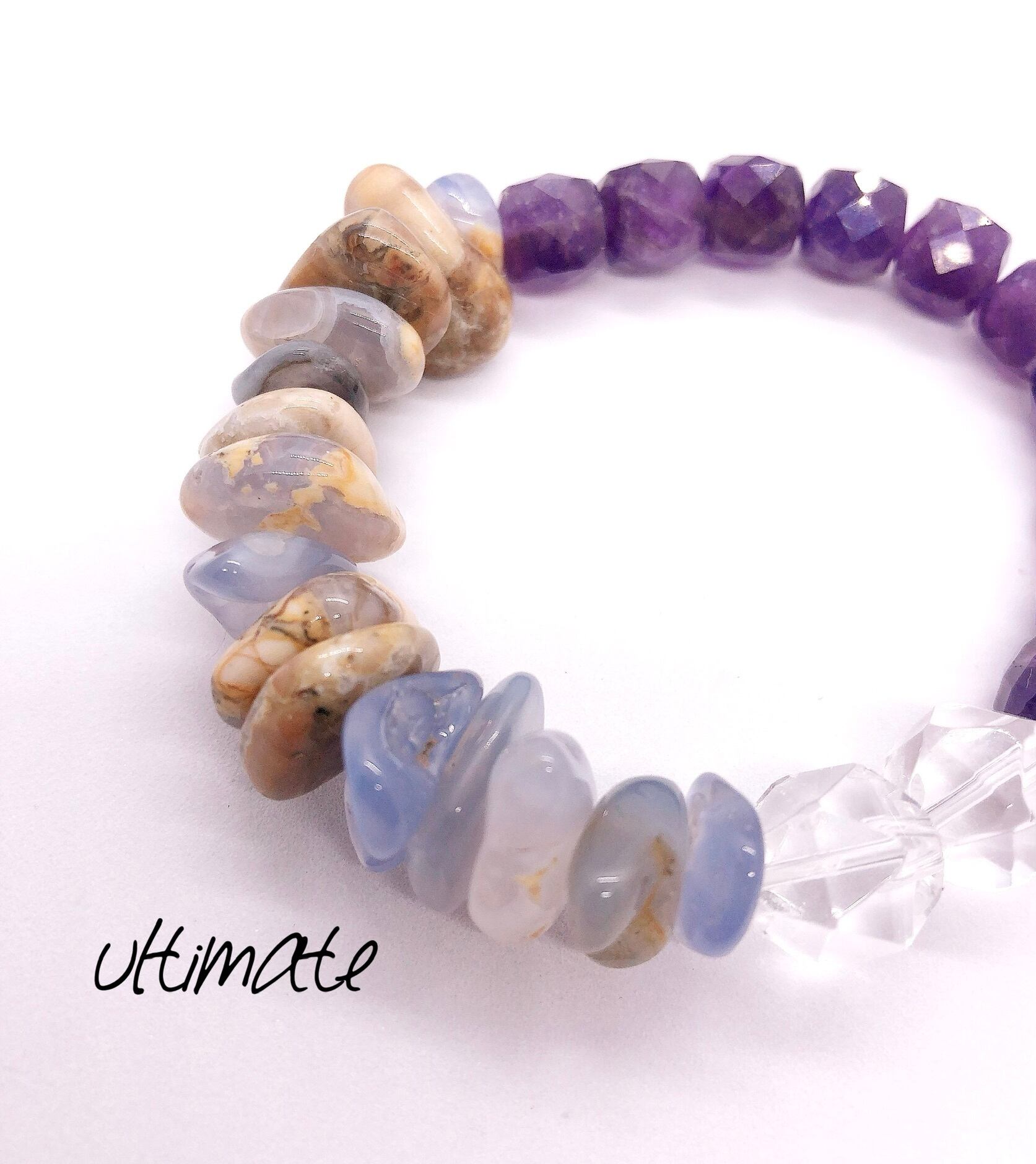石業界でも人気のブルーカルセドニーとキューブ型でカットがキラキラなアメジスト。安定の水晶を足した存在感のあるブレスレットです。