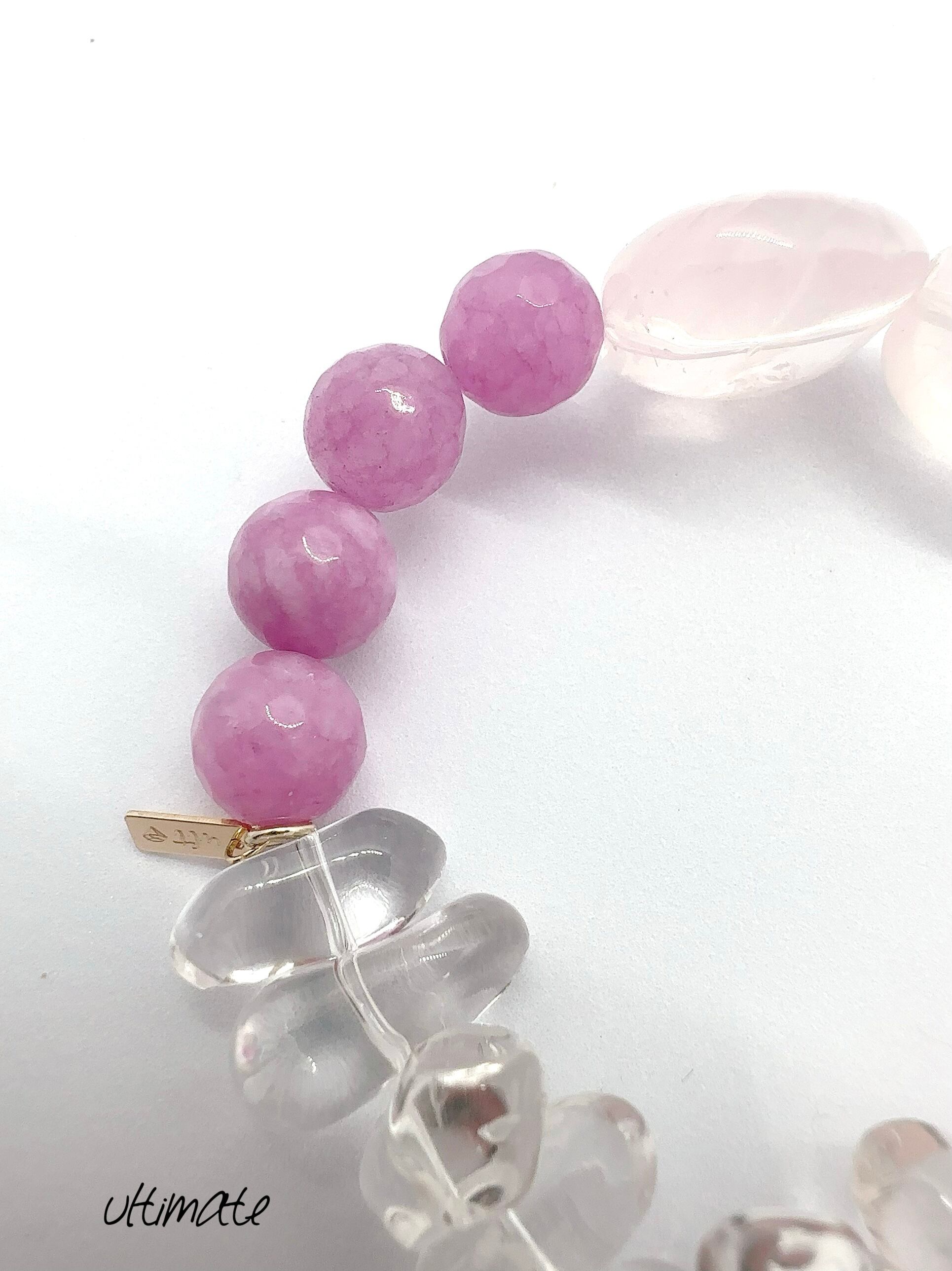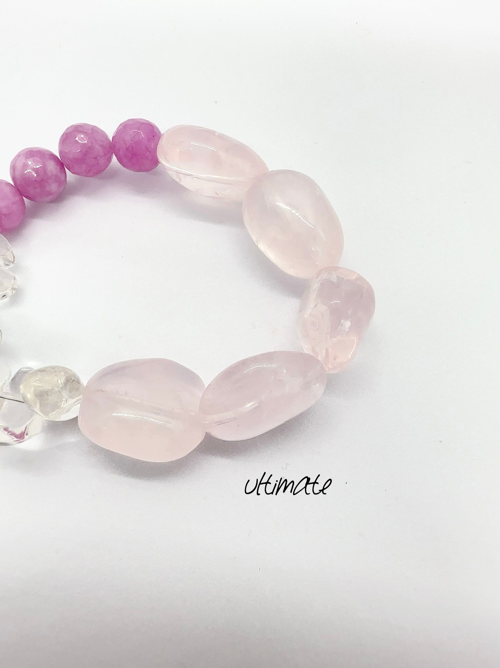 大きめで透明感のあるローズクォーツにパープルピンクのジェードが可愛いブレスレット。