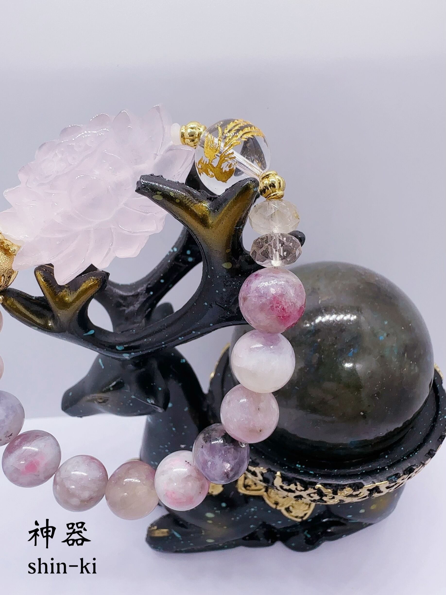stone bracelet《蓮の花》ローズクォーツ×ユニコーンストーン×《四神獣》朱雀×淡水パール×ルチルクォーツ