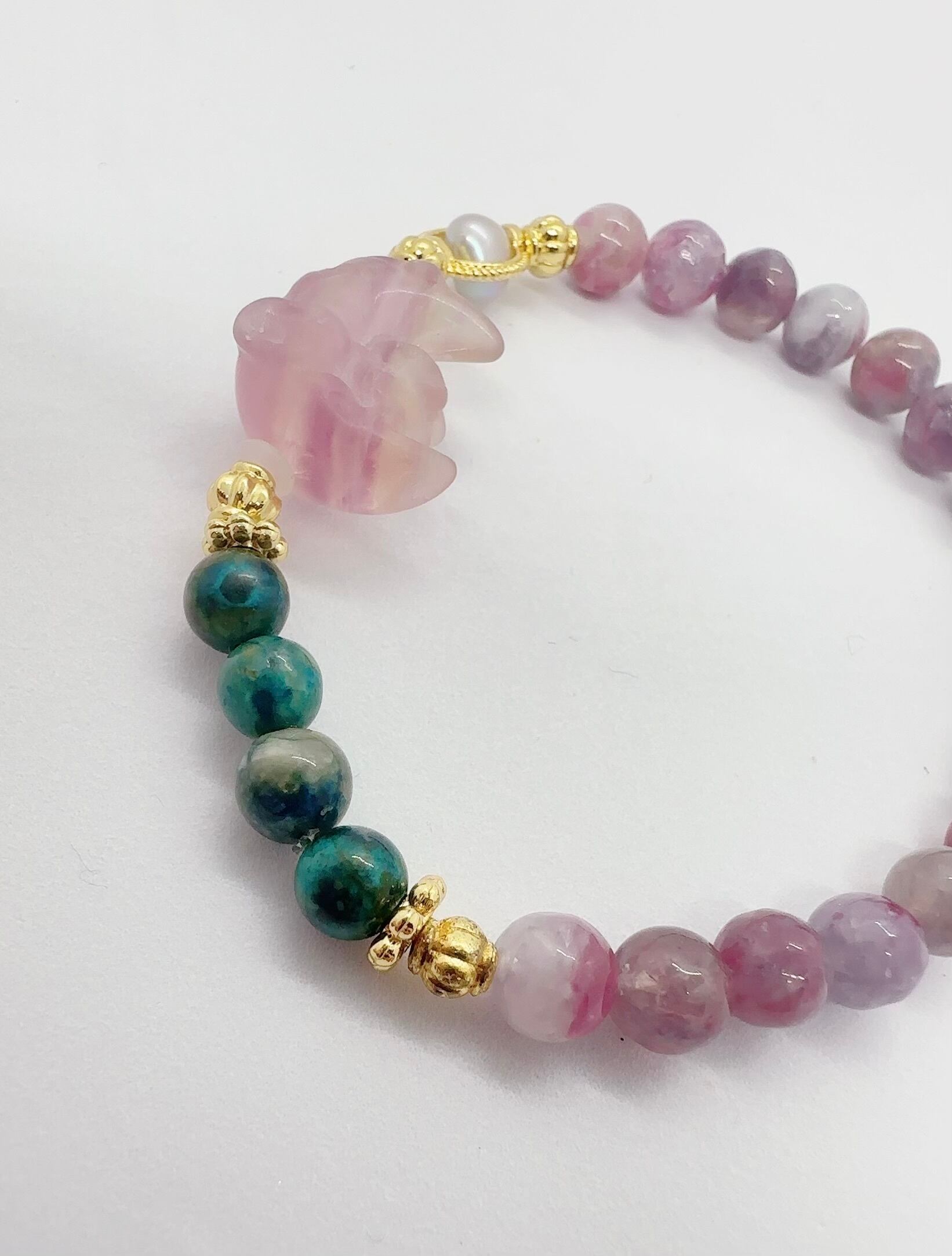 stone bracelet《月兎》フローライト×ユニコーンストーン×クリソコラ×グレー淡水パール