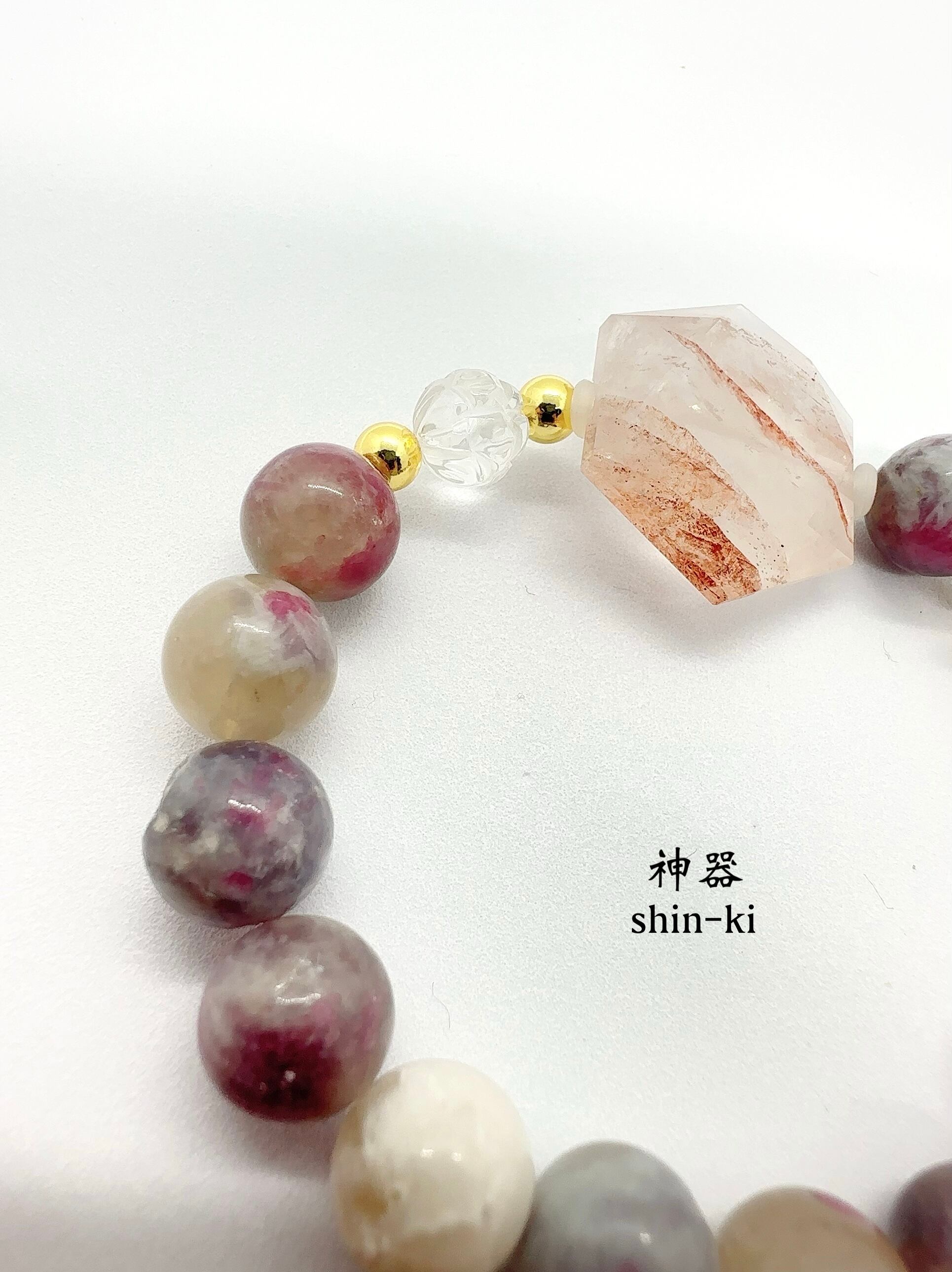 ライモナイトインクォーツ…自然の錆鉄が年月をかけて水晶のクラック部分に染み込み赤や黄色などの膜を形成したもの。自然の神秘。