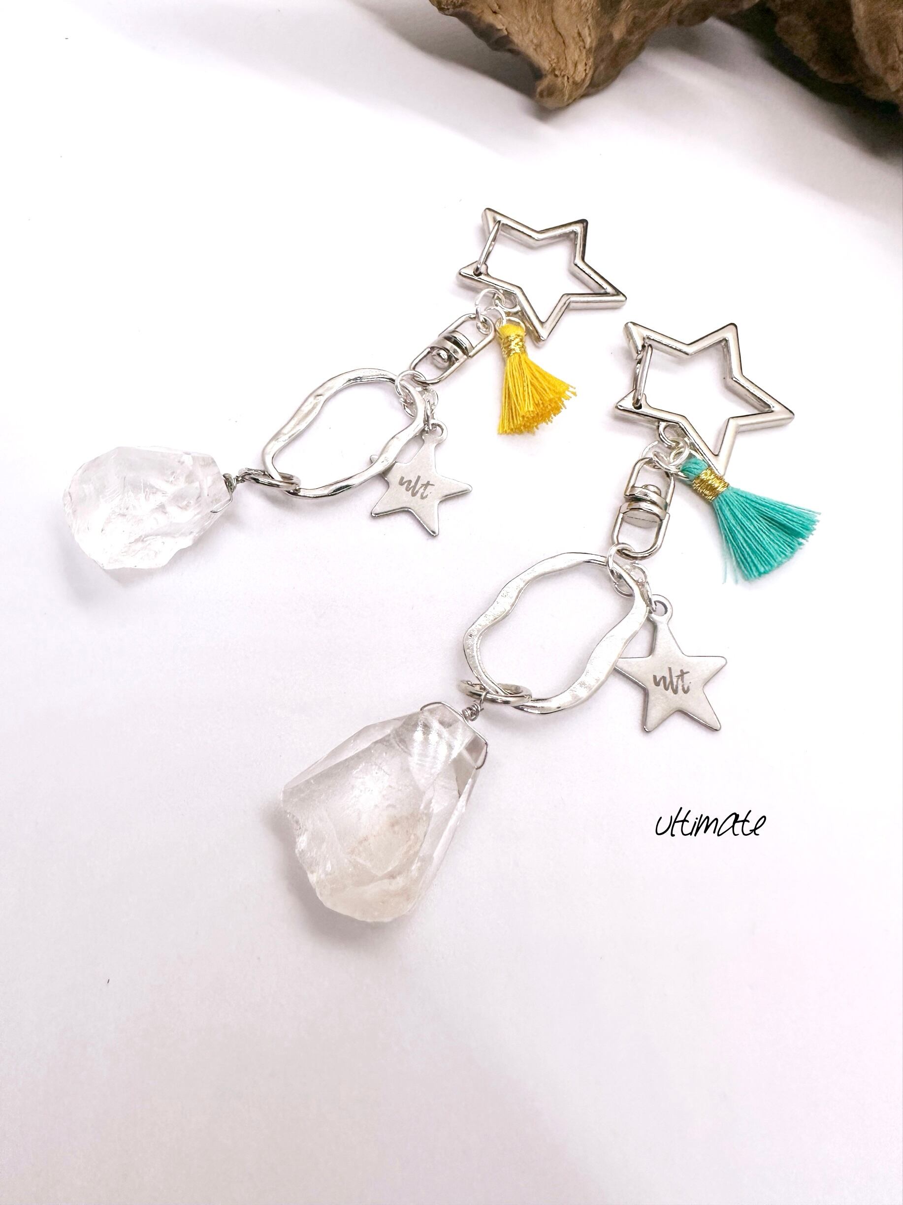 大きめの水晶にミニタッセルが付いた可愛いキーチャーム。