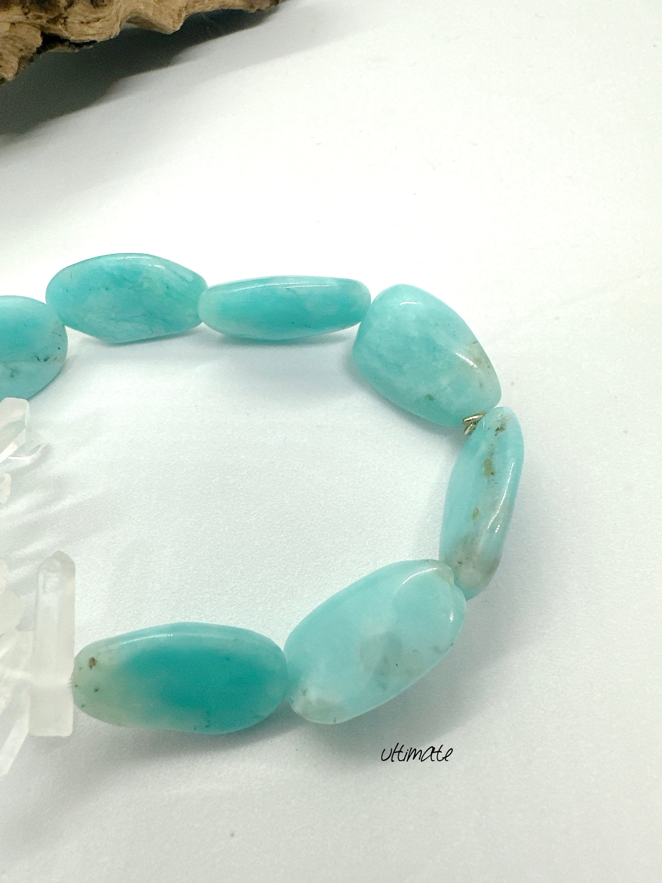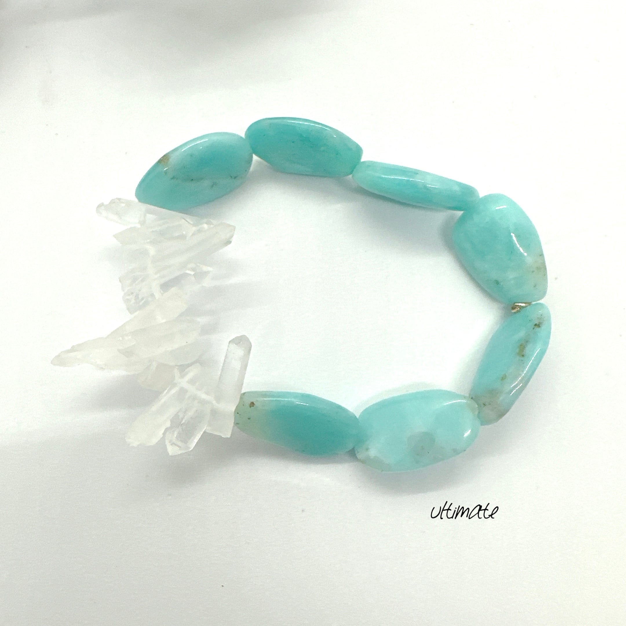 美しいアマゾナイトと氷柱水晶を組み合わせた素敵なブレスレット。色とりどりの天然石が手元を華やかに彩ります。アマゾナイトの独特なブルーグリーンの色合いが、まるで自然の中から生まれたかのような神秘的な魅力を放っています。