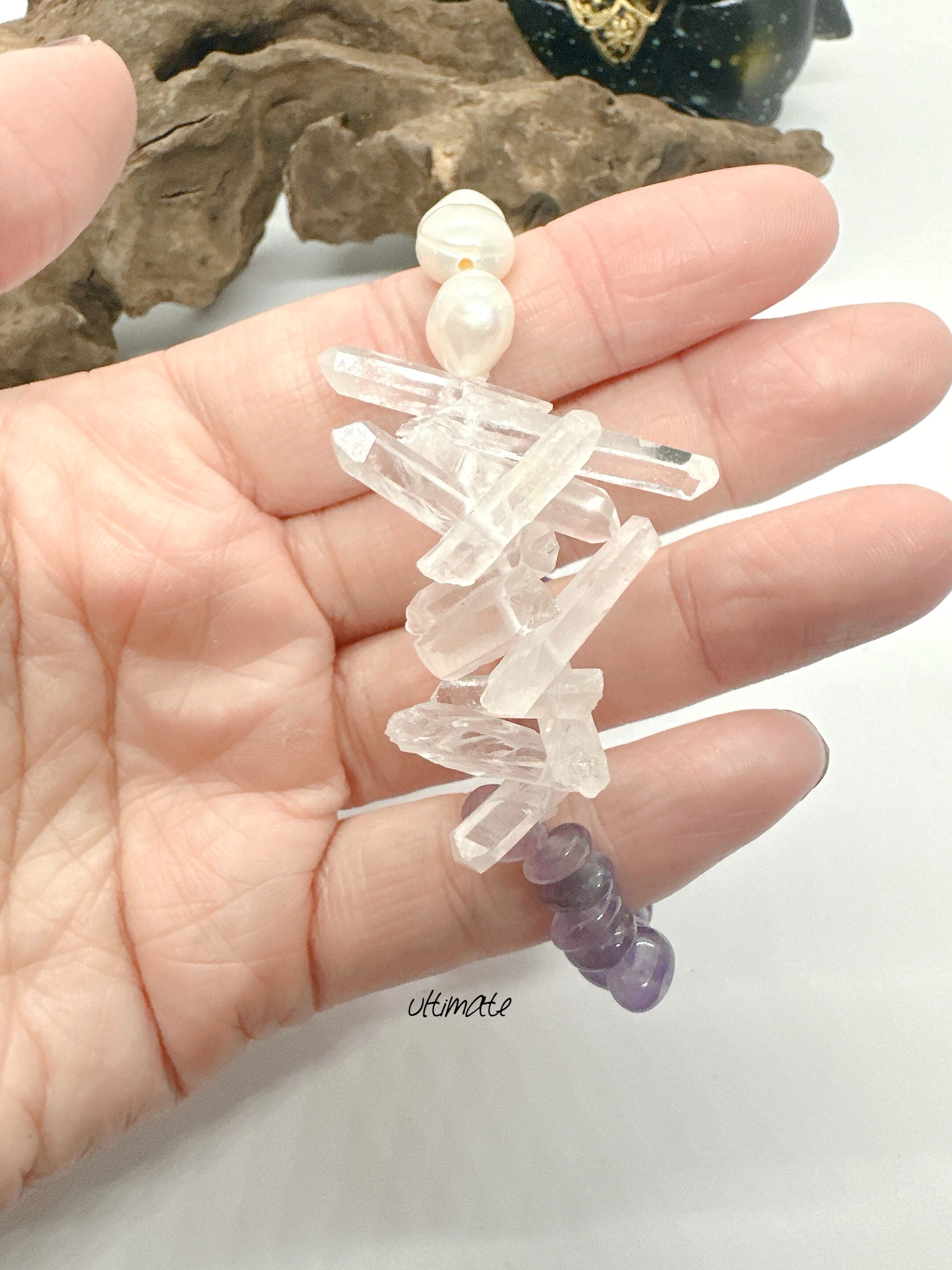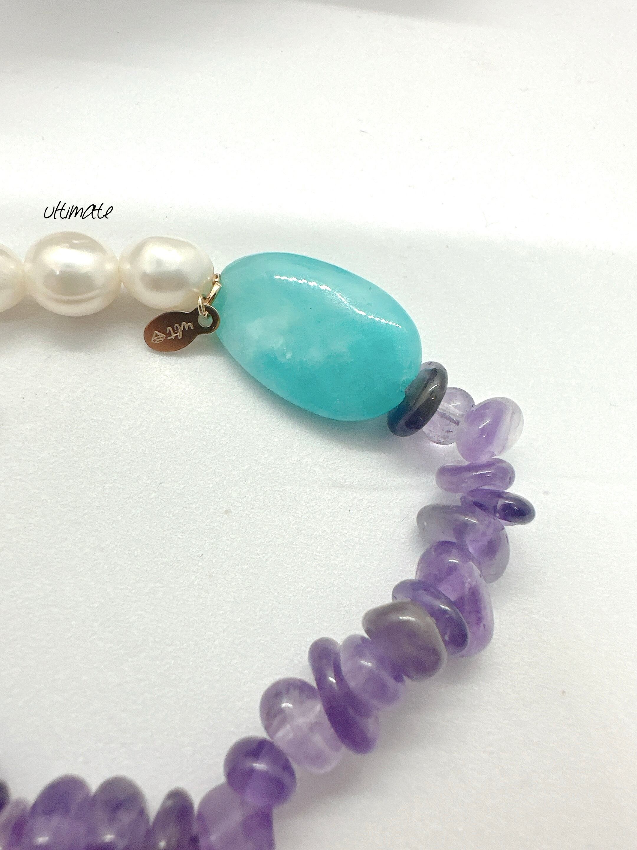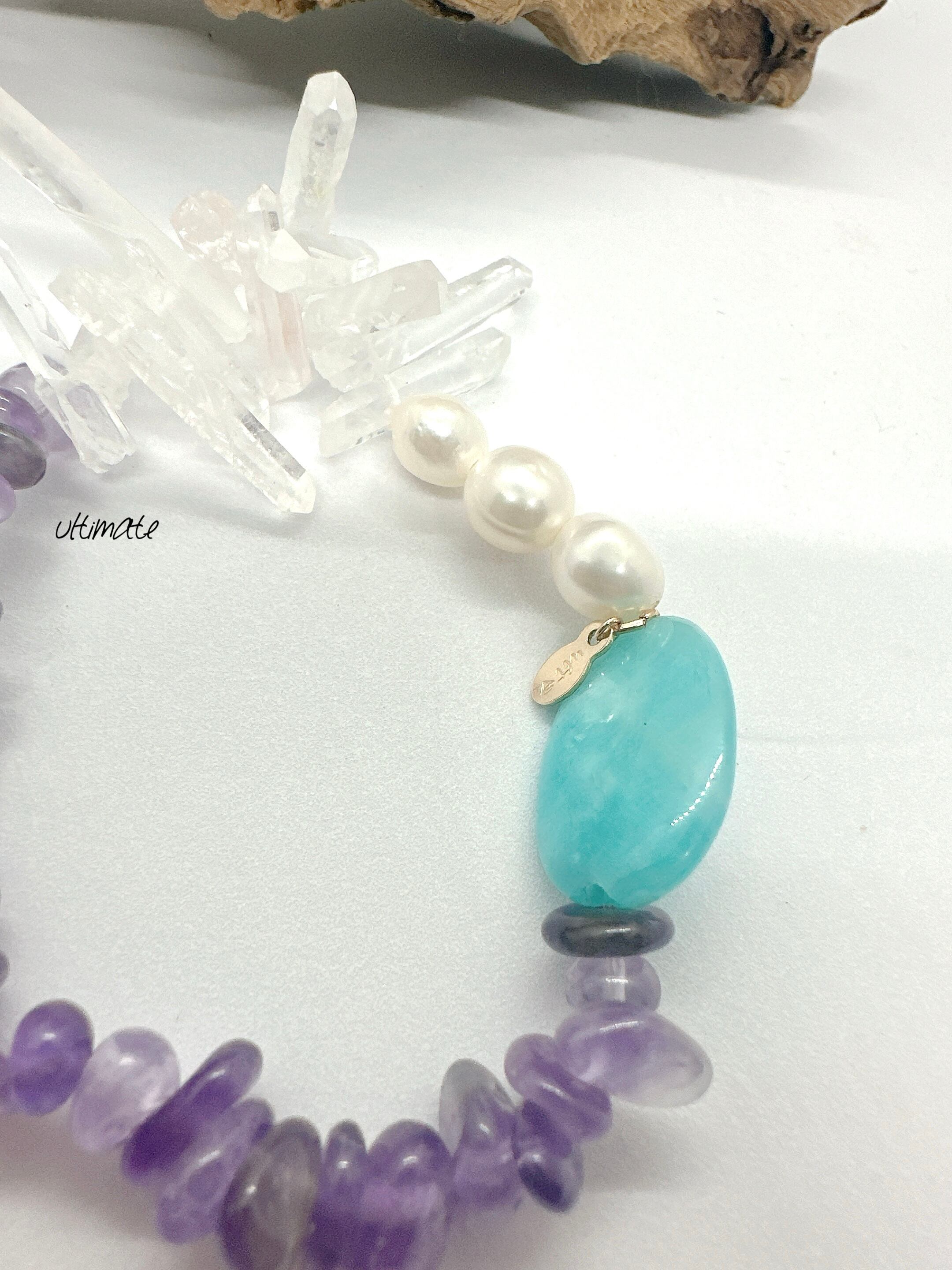 華やかでありながら心を落ち着ける、アメジストと氷柱水晶、アマゾナイト、バロックパールを使用した素晴らしいブレスレット。色とりどりの天然石が手元を美しく演出し、個性的なスタイルを際立たせます。アメジストの深い紫色は、神秘的で魅力的なオーラを放っています。